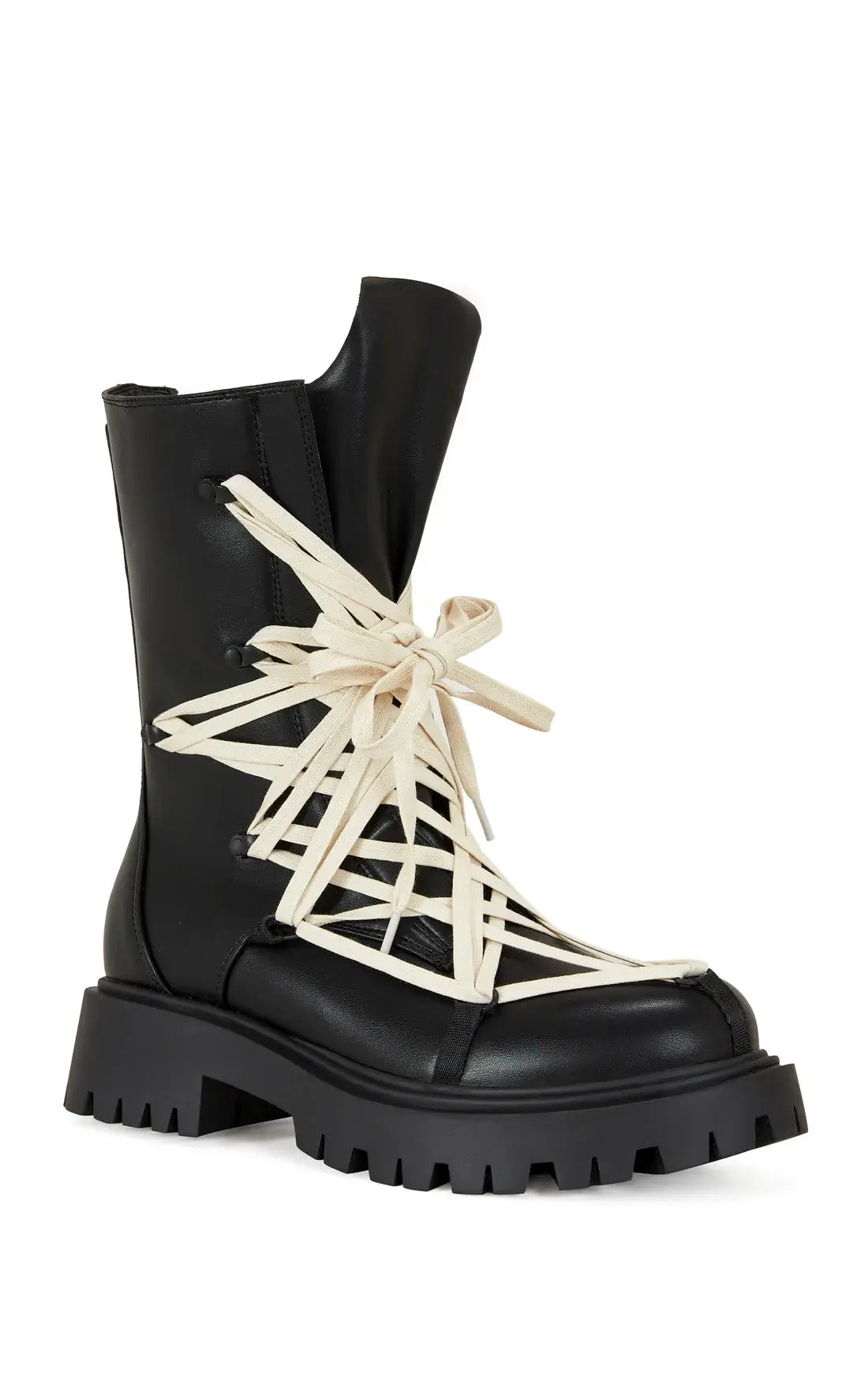 Step up your shoe game with our ARJUN flat bootie. Made from black faux leather, these chunky combat boots make a statement with a unique white shoelace accent scattered over the front boot shaft. Perfect for adding an edgy touch to any outfit.